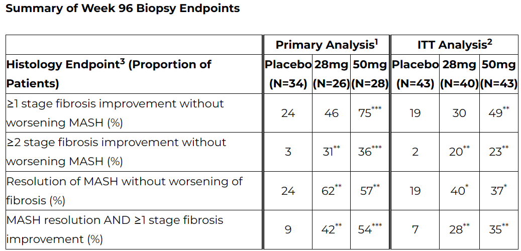 早在2022年9月,该项研究便达到了首个主要终点,第24周时,每周一次皮下注射Efruxifermin 28mg和50mg剂量组均达到了改善肝脏纤维化的主要终点,分别有39%和41%的患者实现了纤维化改善≥1级且MASH没有恶化,而安慰剂组为20%。