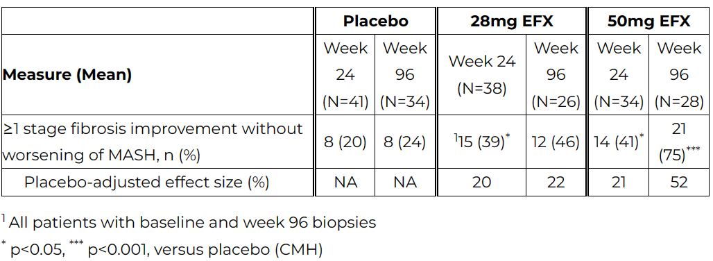 Efruxifermin 50mg组在24周至96周期间,经安慰剂调整的纤维化改善效应大小增加了一倍以上,28mg组略有增加。具体来说,在第24周至第96周期间,Efruxifermin 50mg组的纤维化改善且MASH未恶化的安慰剂调整效应大小从21%增加到52%,28mg组从20%增加到22%。在96周时,50mg组具有高度统计学意义的结果。