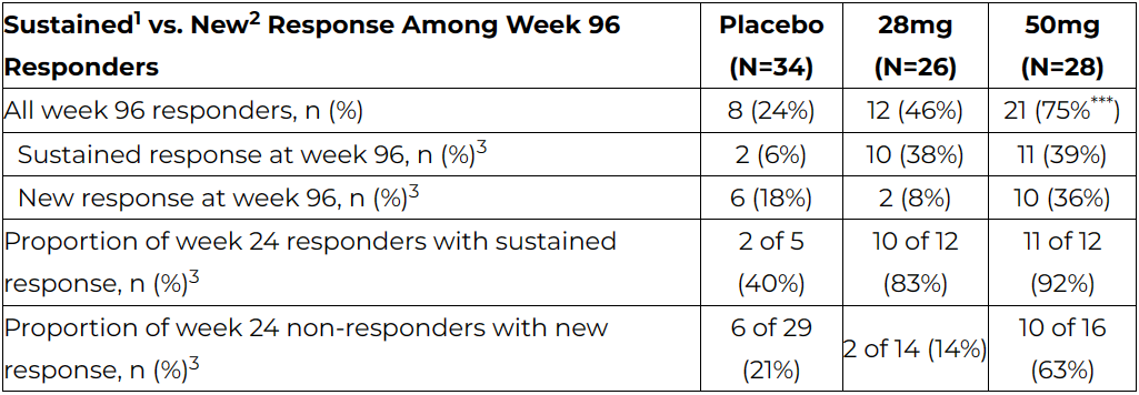 对第24周至第96周治疗效果的分析表明,Efruxifermin组患者不仅实现更广泛的纤维化改善且MASH无恶化,且缓解效果是持续的,特别是50mg剂量组。在第96周进行活检发现,第24周纤维化改善的患者中,50mg和28mg组分别有92%和83%持续保持应答,而安慰剂组为40%。