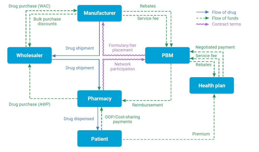 美国药价如此之高的原因非常复杂,主要是一套独特的流通系统所决定的,中间存在PBM这样美国特色的药物流通中间人,以及随之衍生的非常不透明的药物折扣与回扣(图3),这一部分不是本文要讨论的内容。
