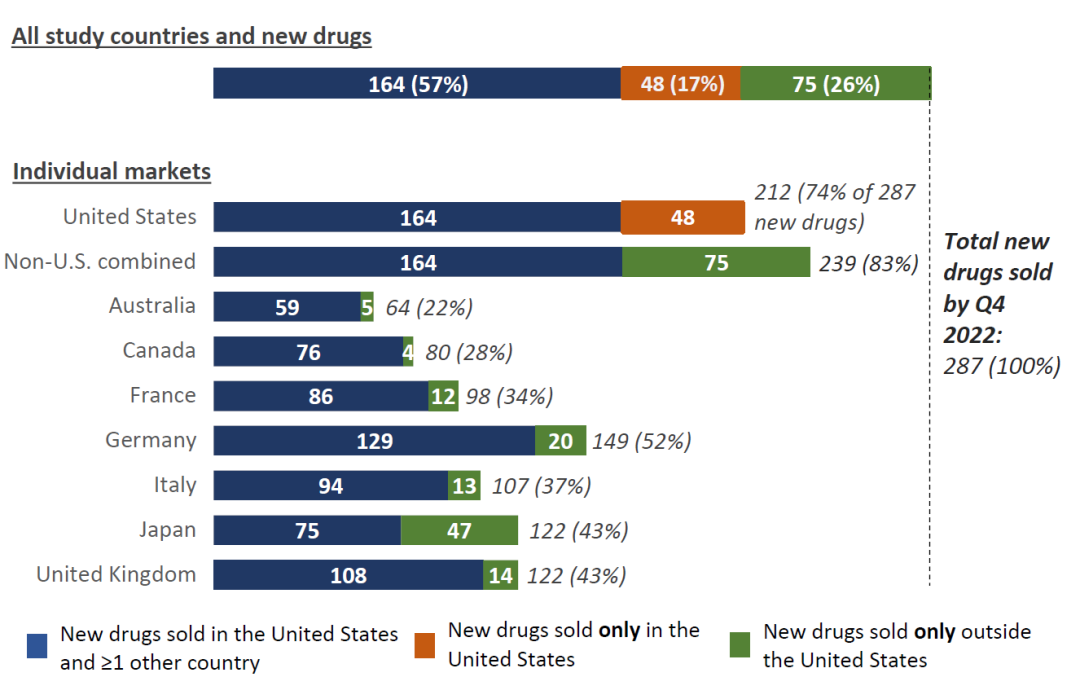 • 截至 2022年第四季度,在美国和对照国家共同销售的164种新药中,有129种(79%)在德国有售,有35种(21%)没有在德国销售。