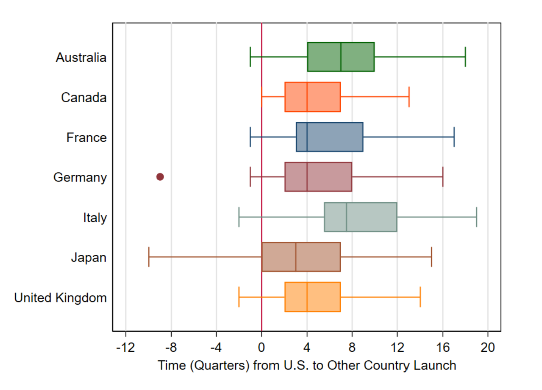 • 在对比国家中,日本的上市速度仅次于美国,日本上市的平均滞后时间(相对于美国)约为三个季度。