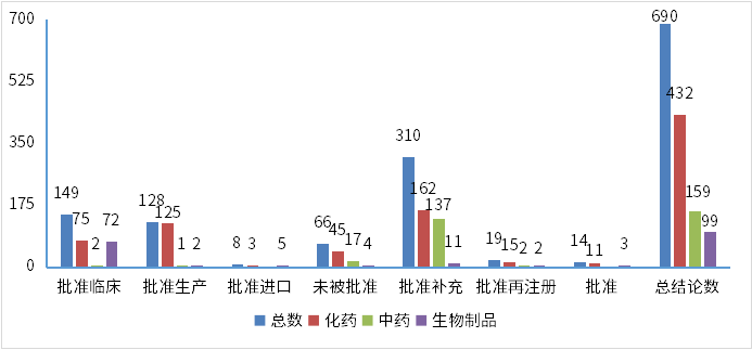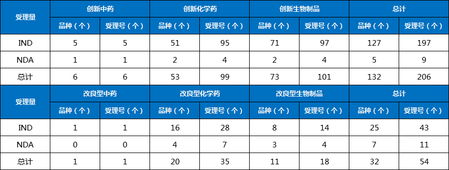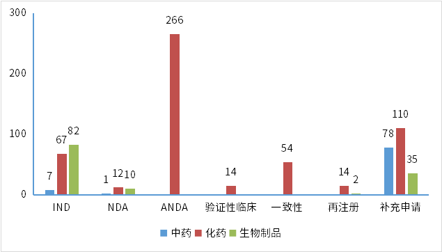 以注册申请审评任务类型统计,受理新药临床试验申请(以下简称IND)156个品种(受理号245个);新药上市许可申请(以下简称NDA)23个品种(受理号34个);同名同方药、仿制药、生物类似药上市许可申请(以下简称ANDA)266个品种(受理号316个);仿制药质量和疗效一致性评价注册申请(该注册申请类别以下简称一致性评价申请)54个品种(受理号79个);各申请类别注册申请受理品种情况详见图1。
