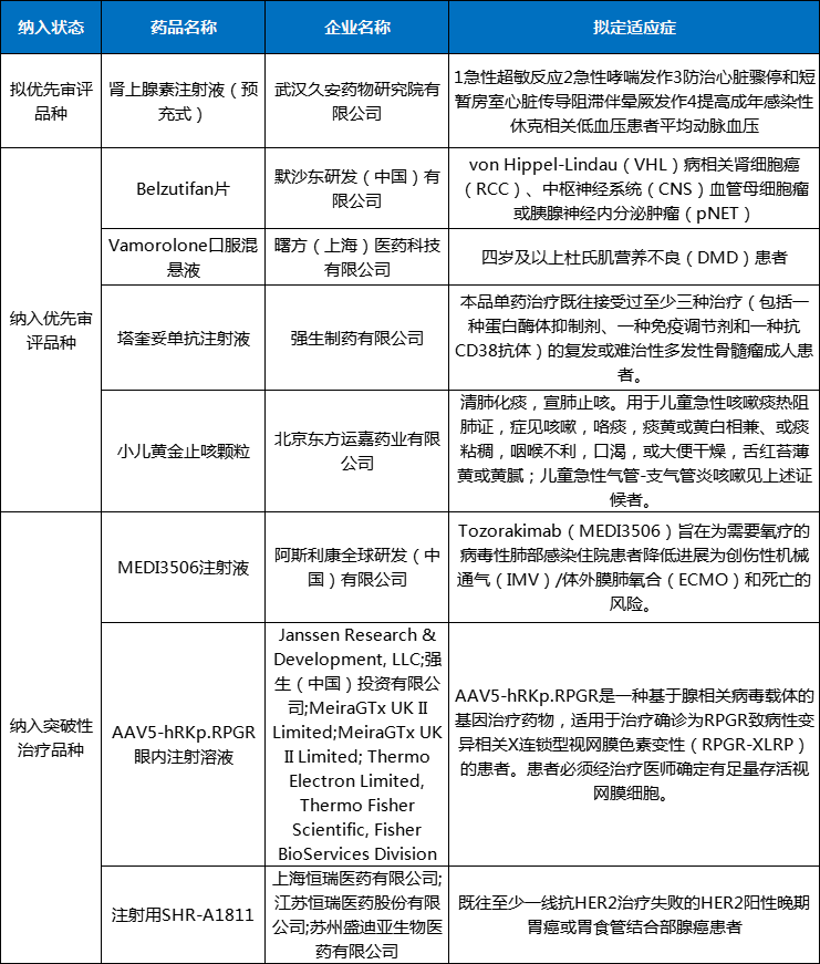 2024年2月份,CDE共将1个品种纳入拟优先审评品种公示名单,以及有4个品种正式纳入优先审评,纳入理由包含纳入突破性治疗药物程序、符合附条件批准的药品以及其他优先审评审批情况;3个品种(受理号CXSL2000087、JXSL2300147、JXSL2300148、JXSL2300004)纳入突破性治疗品种名单。2024年2月优先审评与突破性治疗品种名单详见表三。