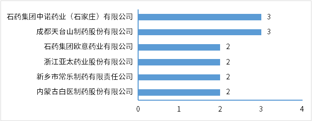 2024年2月份,CDE共受理一致性评价品种54个(受理号79个),石药集团中诺药业(石家庄)有限公司申报有注射用阿莫西林钠克拉维酸钾、注射用头孢哌酮钠舒巴坦钠、注射用头孢米诺钠3个品种,与申报硫酸阿米卡星注射液、盐酸纳洛酮注射液、注射用生长抑素3个品种的成都天台山制药股份有限公司,是2月份申报一致性评价最多品种的两个公司。2024年2月各企业申报一致性评价品种TOP6见图4。