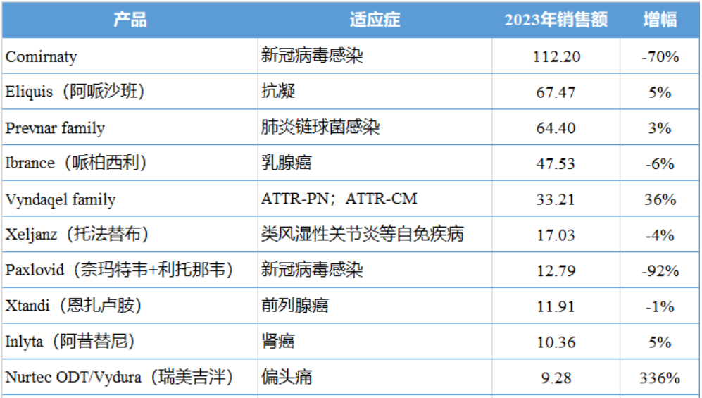 2023年辉瑞TOP10产品销售额(亿美元),图源:医麦客