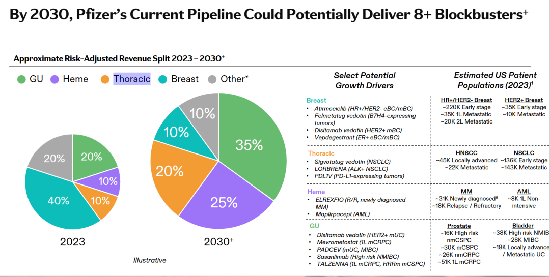 辉瑞预计,到2030年,乳腺癌在肿瘤总销售中的占比将从2023年的约40%降至约10%。相反,泌尿生殖系统癌症有望成为辉瑞最大的肿瘤学业务,占比35%。
