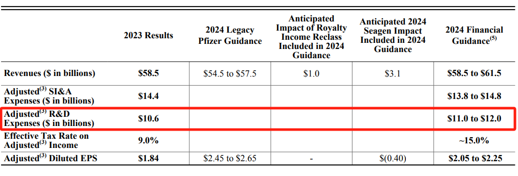 2023年,辉瑞研发投入超过106亿美元,同比下降6%,而随着Seagen的加入,辉瑞将明年的研发投入资金调整到110亿-120亿美元。