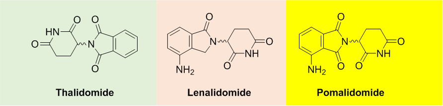 最知名的分子胶降解剂是沙利度胺(thalidomide)及其类似物,例如来那度胺(lenalidomide)和泊马度胺(pomalidomide),统称为免疫调节酰亚胺药物(ImiD,immunomodulatory imide drugs)。