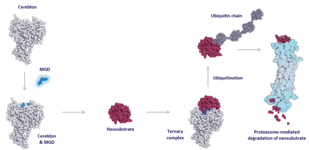 图2 分子胶降解剂介导的E3泛素连接酶Cereblon与目标蛋白结合,引发后者泛素化并被最终降解的过程示意图 图片来源:Monte Rosa Therapeutics