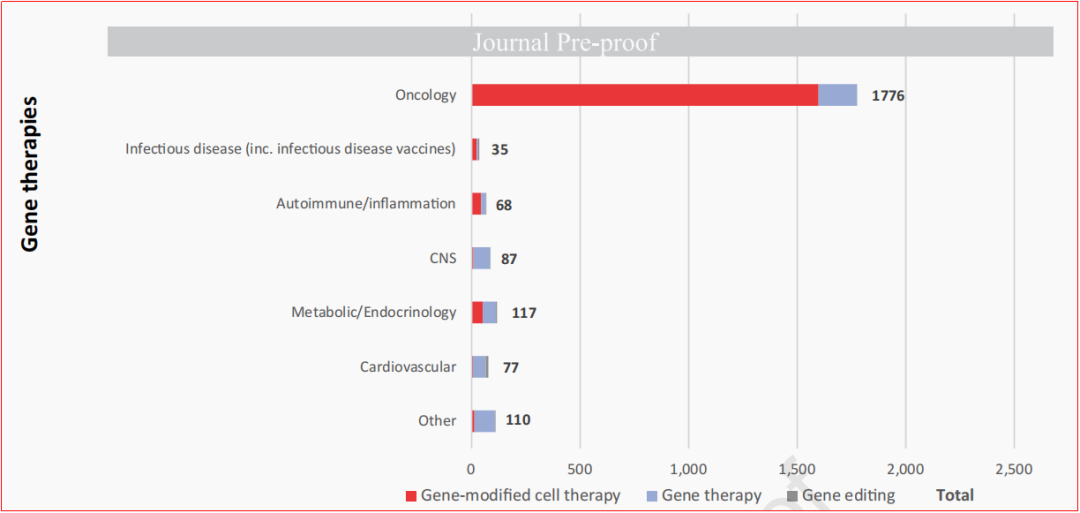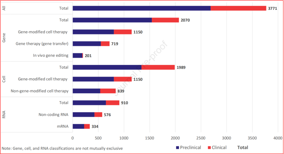 图2 临床积极的基因-细胞-RNA药物统计 信息来源:doi.org/10.1016/j.ymthe.2023.11.001