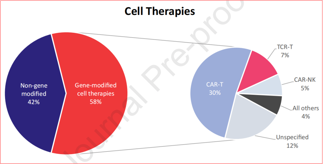 图5 细胞治疗分类及研发占比 信息来源:doi.org/10.1016/j.ymthe.2023.11.001