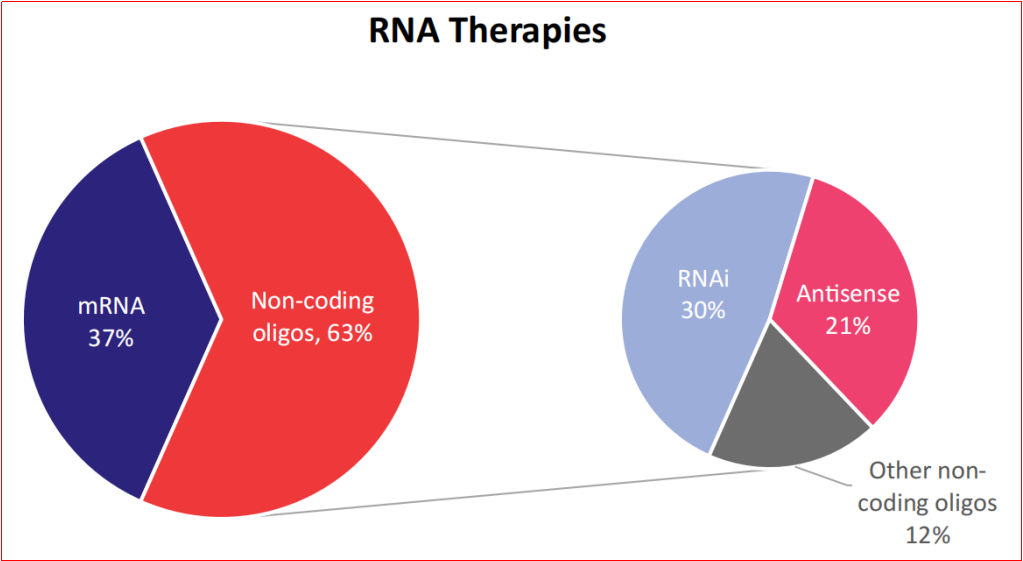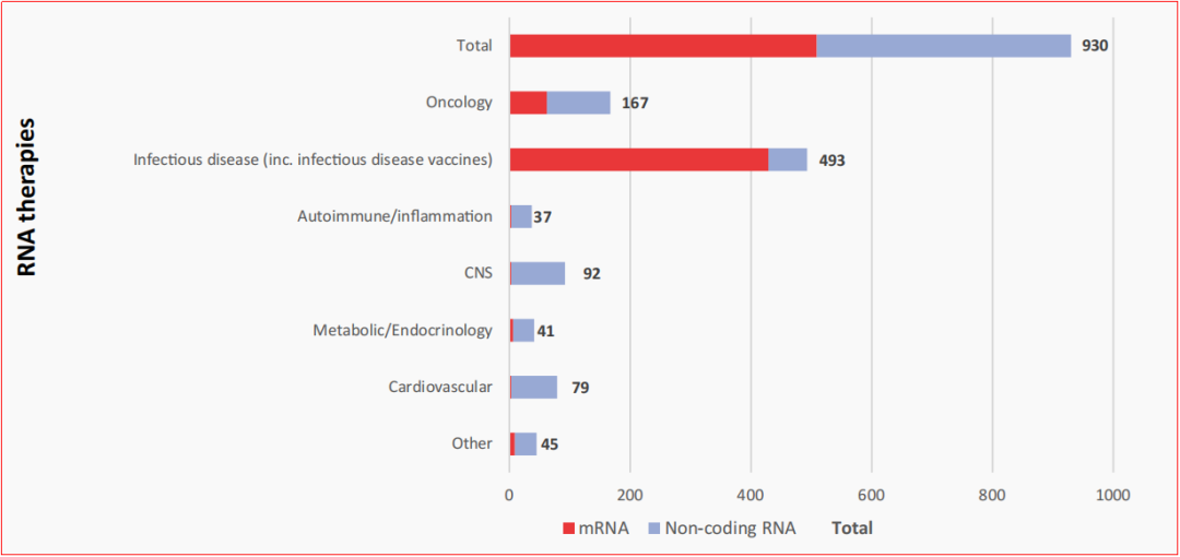 相对于上述的基因疗法和细胞疗法,RNA疗法的研究相对较少,目前有910种基于RNA的疗法,576种(63%)是使用RNA来调节蛋白质的翻译和作用,其余的334种(37%)是基于信使RNA的直接编码序列在体内被核糖体翻译成蛋白质,并基于此来设计疫苗(如SARS-CoV-2)。在334种基于mRNA的产品中,199种开发方向为提高免疫反应,而其余的药物设计并开发为产生治疗性蛋白质。
