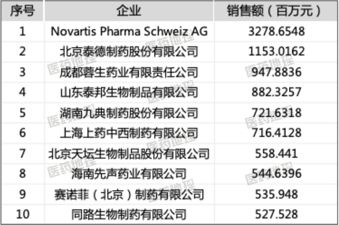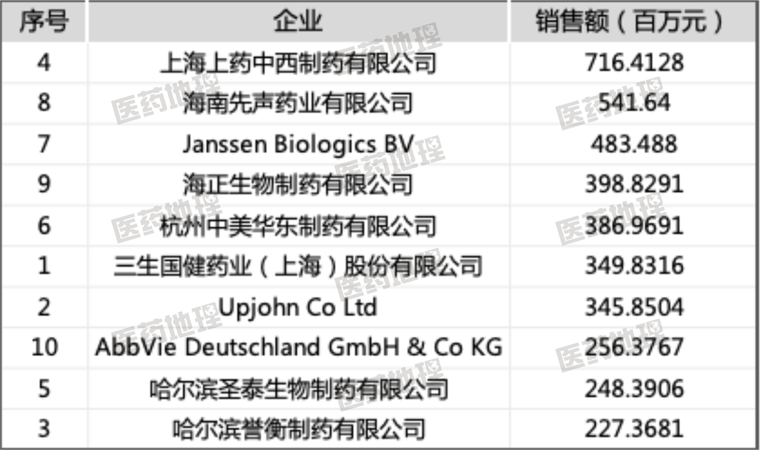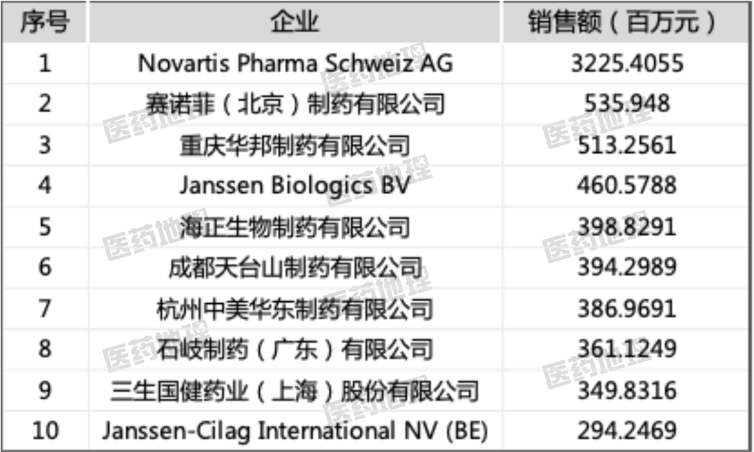 根据Pharma ONE智能药物大数据分析平台统计,目前销售前十的企业销售额总计超过98亿元,而整个自身免疫性疾病国内市场2023年的实际销售额是近370亿元,也就是说前十公司的销售额只占比26.5%。
