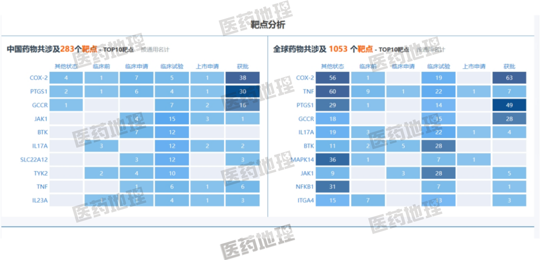 在获批的药物上面我们占据了半壁江山。然而,就研发的靶点来看,中国关于自身免疫性疾病涉及的靶点一共是283个,而全球总共涉及的靶点是1053个,占比仅有26.7%;相较于药物注册的能力,国内靶点发现上面还需要下更多的功夫。此外,根据前十的靶点来看,国内研发的焦点是COX-2、PTGS1和GCCR三个靶点,而在全球市场上来看,大致情况一样,但是特别突出了TNF这个靶点。