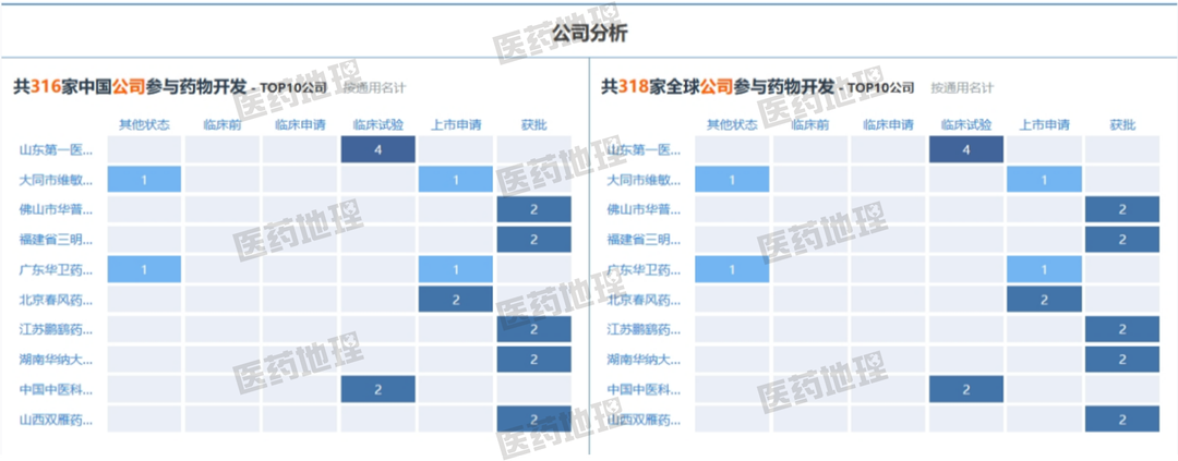 对比参与药物开发的top10企业和销售前十的企业可以看出,数据大部分都重合了。但其中,山东第一医科大学附属省立医院(山东省立医院)有4项临床在研项目。根据山东省立医院最近的新闻稿,山东省立医院消化内科与山东省脐血库正在开展一项脐带血单个核细胞治疗慢性萎缩性胃炎的临床研究,并且该研究正在招募患者入组。