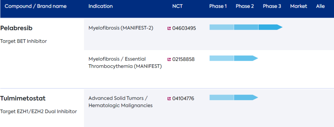 而留下的管线还剩三个项目,分别是已上市的CD19单抗MOR208,和剩下的两款在研药物——BET抑制剂Pelabresib,正处于临床III期试验;和EZH1/2蛋白双重抑制剂Tulmimetostat,处于临床I/II期。