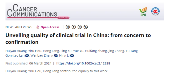 原文链接:Huang H, Hou Y, Fang H, et al. Unveiling quality of clinical trial in China: from concern to confirmation. Cancer Commun (Lond). Published online March 6, 2024. doi:10.1002/cac2.12528