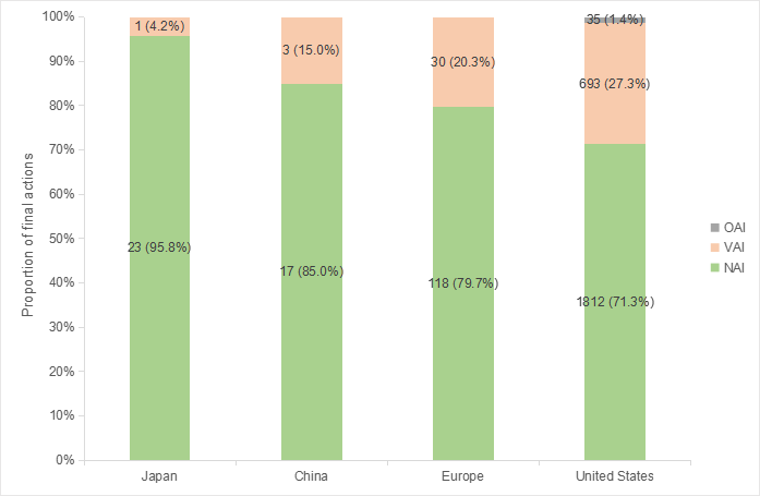 2016年1月至2023年7月期间,美国FDA对欧洲、美国、日本和中国的临床试验机构共进行了2732次FDA核查。根据发现问题的严重程度,最终结果分为需要采取官方措施(OAI)、自愿采取行政措施(VAI)和不需要采取措施(NAI)三个不同的类别。分析发现,美国无需采取行动结果(NAI)比例最低,为71.3%,低于日本的98.5%(p=0.008)和欧洲的79.7%(p=0.027)。中国的NAI比例为85.0%,与其他三个地区相比并没有显著差异,显示出中国与其他被调查地区相当的试验质量。对比FDA在2016年前后对中国机构的核查结果发现,无需采取行动结果(NAI)比例由2009-2015年的48.0%提高至2016-2023年的85.0%,试验质量明显提升。