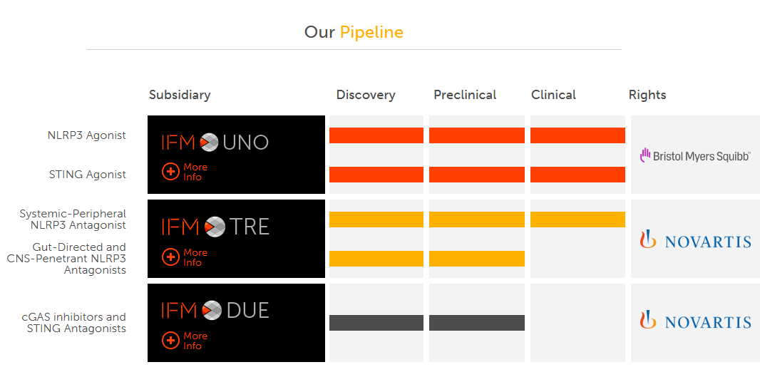 2019 年 4 月,诺华收购了IFM 子公司 IFM Tre,支付了 3.1 亿美元的预付款和 12.6 亿美元的各种里程碑付款。通过此次收购,诺华获得了IFM Tre 旗下NLRP3抑制剂组合的全部权利。