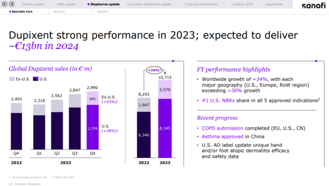 2023年底,Nature杂志子刊发布《TOP product forecasts for 2024》预测了2024年销售额排名TOP10的产品,其中艾伯维的修美乐掉出了前十榜单,而赛诺菲的度普利尤单抗预计将进入前三甲。