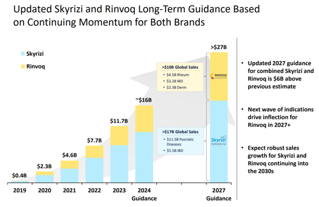 其中,利生奇珠单抗于2019年首次进入全球市场,目前已斩获5项适应症,包括斑块状银屑病、银屑病关节炎、克罗恩病、泛发性脓疱型银屑病以及红皮病型银屑病。2024年,利生奇珠单抗也有望获美国FDA批准溃疡性结肠炎新适应症。上市至今,利生奇珠单抗销售额一路跳跃式增长,每年都维持高双位增幅,照此增速,2024年营收突破百亿美元不在话下。当然,利生奇珠单抗强劲的发展势头与艾伯维精心展开的猛烈攻势息息相关。据悉,艾伯维围绕利生奇珠单抗正在推动近60项临床研究。