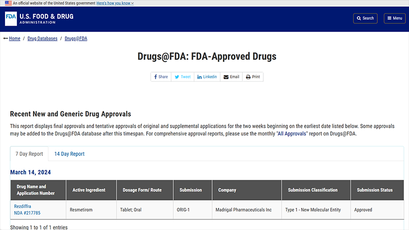 据美国食品药品监督管理局(FDA)官网披露,3月14日该局批准了马德里加尔制药公司(Madrigal)的瑞美替罗(Rezdiffra,活性成分为resmetirom)联合饮食和运动,用于治疗患有中重度肝纤维化的非肝硬化非酒精性脂肪性肝炎(NASH)/代谢功能障碍相关脂肪性肝炎(MASH)成人患者。这是获得FDA批准的首款NASH疗法,是该领域一项重要里程碑。