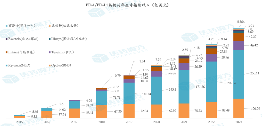 截至目前,全球范围内已有25款PD-(L)1抗体(包括双抗)获批上市,相较于2022年新增了3款创新药和1款改剂型新药。尽管竞争激烈,但全球市场规模依旧在新药王K药(Keytruda)的带动下稳步增长,已经超过466亿美元。