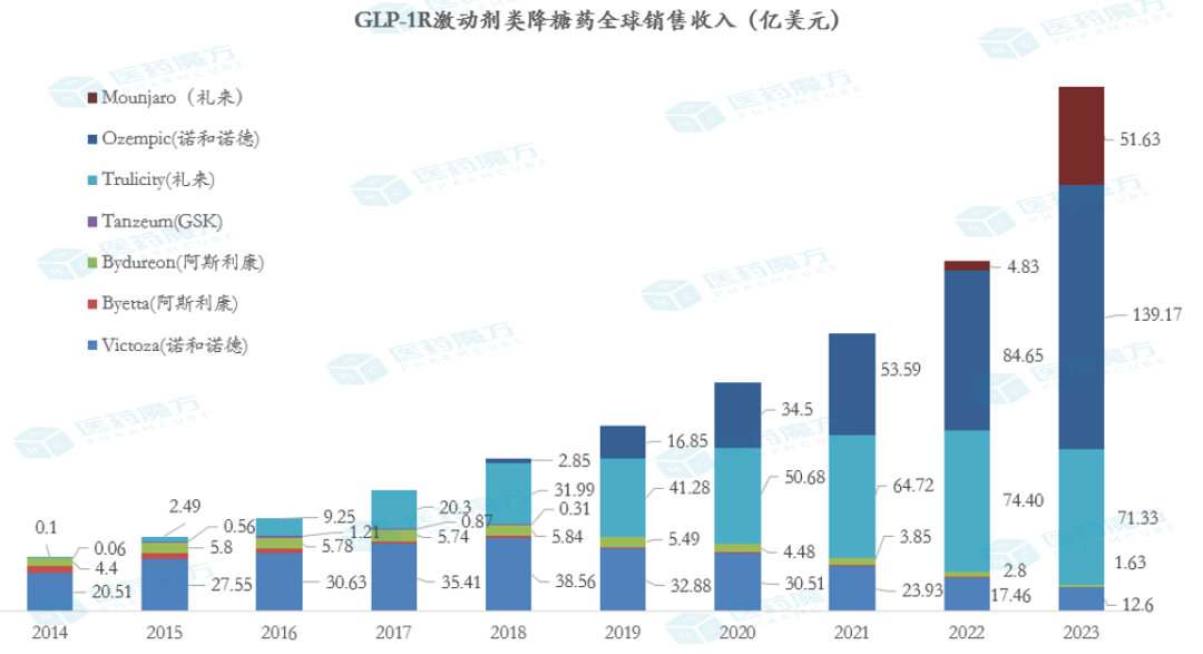 GLP-1当下的热度丝毫不亚于10年前的PD-(L)1,甚至是更胜一筹;2023年,礼来和诺和诺德两大霸主的重磅产品司美格鲁肽、度拉糖肽、替尔泊肽、利拉鲁肽占据了GLP-1类药物近乎100%的市场份额。
