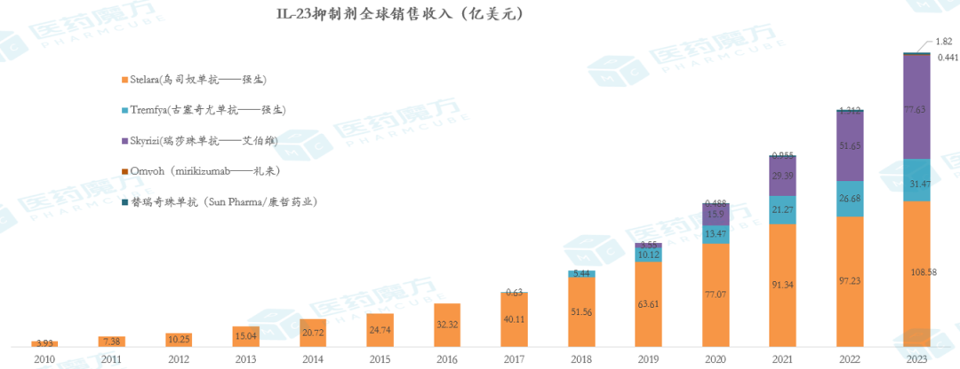 自免领域的市场规模仅次于肿瘤领域。2023年,全球自免业务收入TOP 10药企的自免产品收入合计达到近950亿美元。这其中,IL-23单抗类产品占据着举足轻重的位置。经统计全球已获批上市的5款IL-23靶向新药总销售额高达近220亿美元。