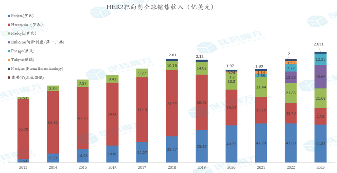 ADC药物的成功,特别是Enhertu(DS-8201)的横空出世,让HER2再次成为热门领域的竞争靶标,这一赛道的市场规模也出现了第二波增长,2023年全球总销售额达121.17亿美元。尽管Herceptin(曲妥珠单抗)、Perjeta(帕妥珠单抗)已日落黄昏,不过仍占据一定市场规模。