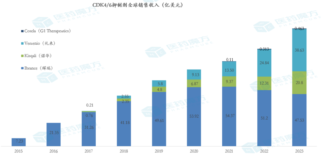 CDK4/6抑制剂联合内分泌治疗已成为HR+/HER2-乳腺癌患者晚期一线、二线以及早期辅助治疗新标准,这也是这类药物自上市以来迅速获得医生患者认可并成长为重磅炸弹的主要原因。自首款药物上市以来,CDK4/6抑制剂的市场规模逐年攀升,2023年总销售额高达107.4亿美元。