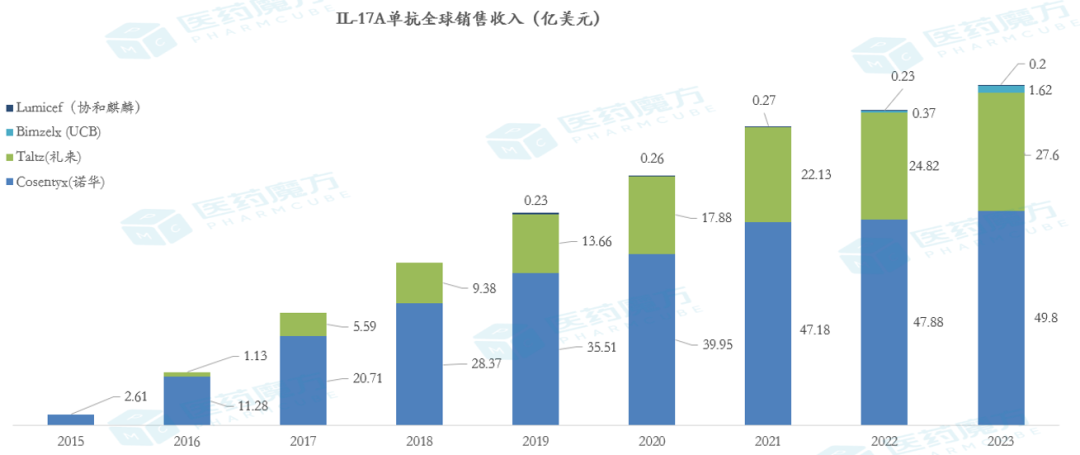 IL-17A是继IL-12/23之后,自免领域的另一个黄金赛道,2023年全球销售额达79.2亿美元。目前全球上市的5款新药中,诺华的Cosentyx(司库奇尤单抗)和礼来的Taltz(依奇珠单抗)几乎占领了全部市场份额。