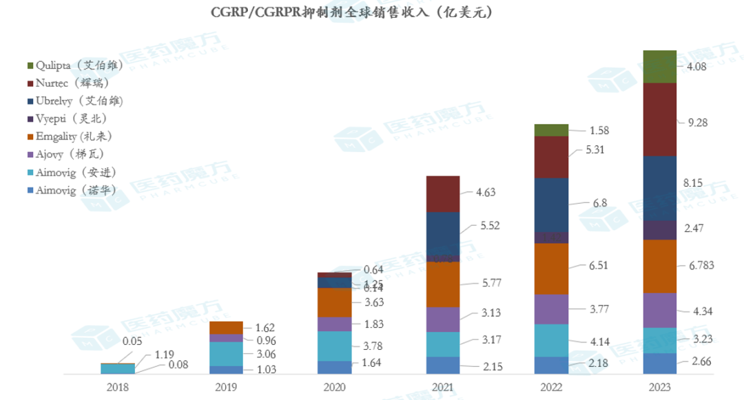 2023年CGRP/CGRPR类新药市场规模达到41亿美元。与很多靶向药市场份额相对集中不同的是,这7款CGRP/CGRPR类药物均各自占据着一定的市场份额。