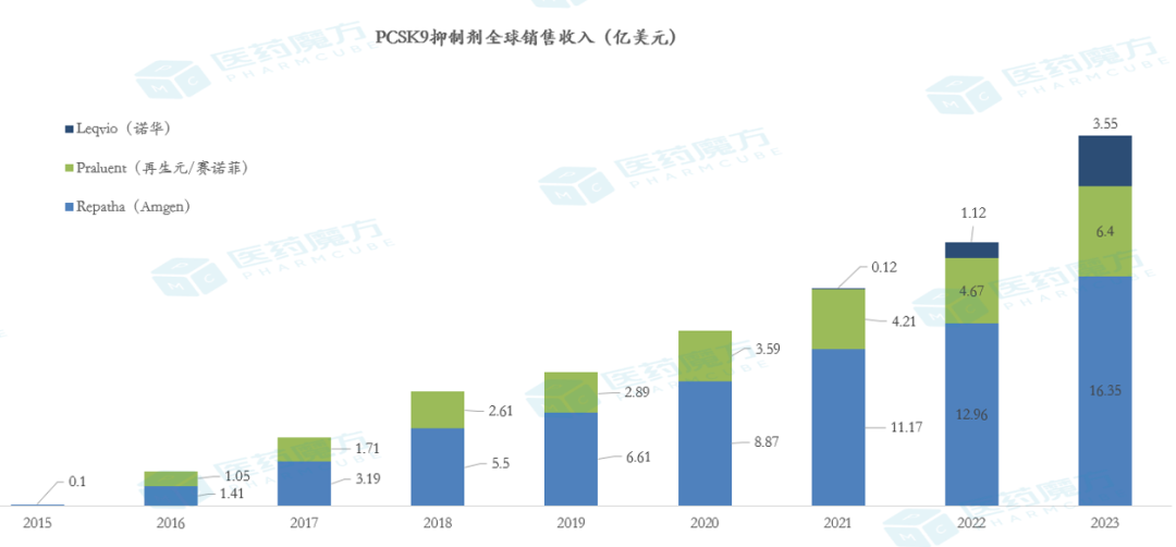 2024年,有一款PCSK9靶向新药上市,为信达的托莱西单抗。不过PCSK9领域的竞争格局没有变化,除了托莱西单抗尚未公布销售收入外,另3款PCSK9 抑制剂在2023年达到了26.3亿美元的市场规模,安进Repatha(依洛尤单抗)市场份额占比依旧最高。