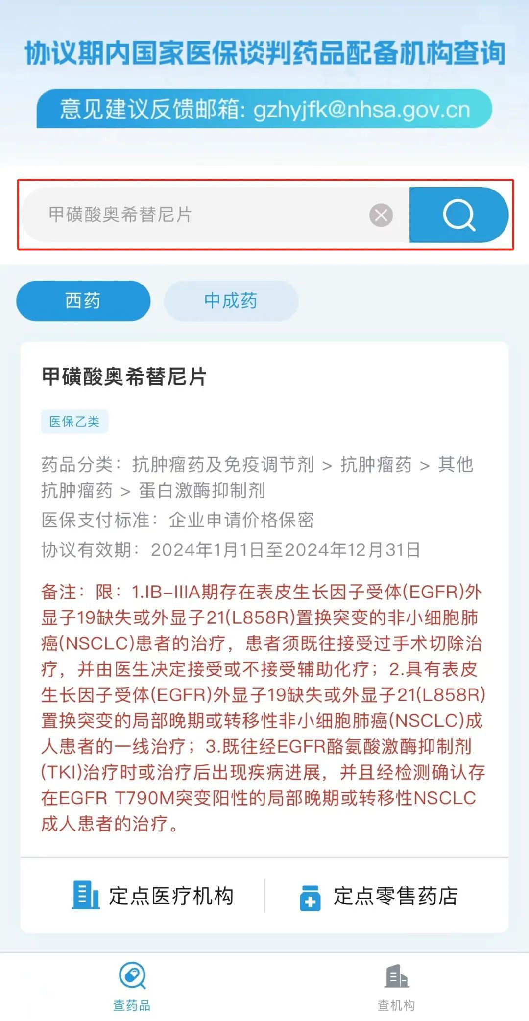 如您对“国谈药”配备机构查询功能有意见建议,可以通过电子邮件(gzhyjfk@nhsa.gov.cn)向我们反馈。