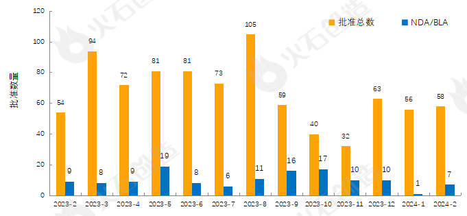 图1 2023年2月—2024年2月FDA药物批准数量变化情况 来源:火石创造产业数据中心