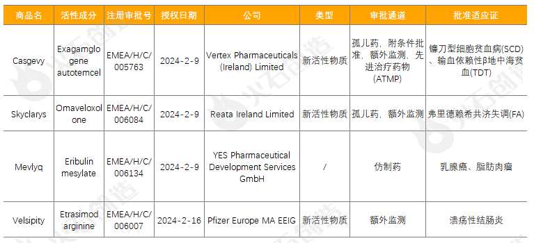 截至2024年3月7日,EMA在2月新授权4款药品上市,其中包含3款新活性物质,见表2。其中Casgevy是一款CRISPR/Cas9基因编辑疗法,是欧盟首款获批上市的CRISPR基因编辑疗法,2023年11月,该产品获英国药品和健康产品管理局(MHRA)有条件上市许可,用于治疗12岁及以上镰刀型细胞贫血病(SCD)与输血依赖性β地中海贫血(TDT)患者,成为全世界首款获批上市的CRISPR基因编辑疗法,美国FDA于2023年12月与2024年1月先后批准该疗法用于治疗SCD与TDT患者,并授予其再生医学先进疗法认定、快速通道资格、孤儿药资格和罕见儿科疾病认定;Skyclarys是欧盟境内批准的第一款治疗弗里德赖希共济失调 (FA) 这种罕见的遗传性进行性神经退行性疾病的治疗方法;Velsipity是欧盟第一个也是唯一一个获批用于16岁及以上患者的新一代口服治疗溃疡性结肠炎药物。表2 2024年2月EMA授权药物