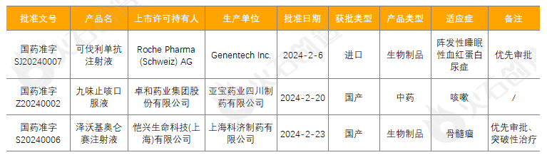 罗氏申报的可伐利单抗注射液通过优先审评审批程序上市,用于治疗未接受过补体抑制剂治疗的阵发性睡眠性血红蛋白尿症成人和青少年(≥12岁)患者。阵发性睡眠性血红蛋白尿已被纳入我国第一批罕见病目录,该药全球同步研发,中国首先批准上市,为患者提供了新的治疗选择。卓和药业申报的九味止咳口服液用于治疗急性气管-支气管炎中医辨证属风热证的咳嗽,由矮地茶、枇杷叶、麻黄、苦杏仁、薄荷、陈皮、竹茹、鱼腥草和炙甘草九味中药材精炼而成。该药品的上市为急性气管-支气管炎咳嗽患者提供了又一种治疗选择。科济药业生产的泽沃基奥仑赛注射液用于治疗复发或难治性多发性骨髓瘤成人患者,是继信达/驯鹿的伊基奥仑赛、复星的阿基仑赛、纳基奥仑赛、瑞基奥仑赛之后,第五款在国内获批的CAR-T产品。2023年1月,科济药业授予华东医药该款药品在中国大陆地区的独家商业化权益。