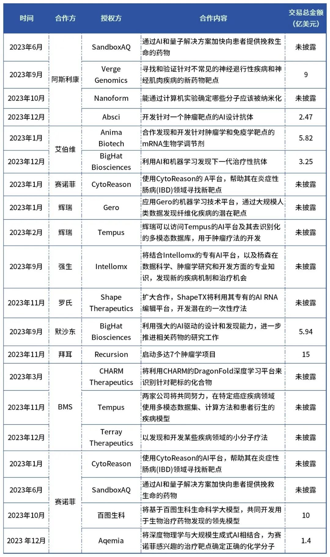 据不完全统计,2023年MNC在AI+制药领域主要进行了超20项合作,其中,阿斯利康、赛诺菲、BMS、艾伯维等跨国巨头一年中在AI领域发起多次合作。
