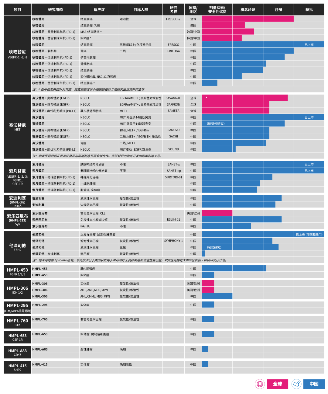 除上述药物外,和黄医药还有索乐匹尼布——一种新型、高选择性靶向Syk(脾酪氨酸激酶)的口服抑制剂,在中国获纳入突破性治疗药物品种,用于原发免疫性血小板减少症,中国新药上市申请已获受理;他泽司他(达唯珂®,2022年5月于海南博鳌乐城国际医疗旅游先行区获批,用于治疗某些上皮样肉瘤和滤泡性淋巴瘤患者)等药物获批或推进中,见下图。