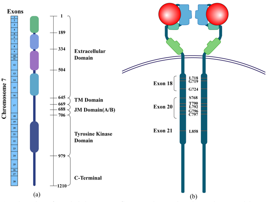 EGFR位于7号染色体上,该染色体由28个外显子组成。EGFR由细胞外结构域、疏水性跨膜结构域(TM结构域)、近膜结构域(JM结构域)、结合配体的细胞内蛋白酪氨酸激酶结构域和C末端组成(图1)[1]。