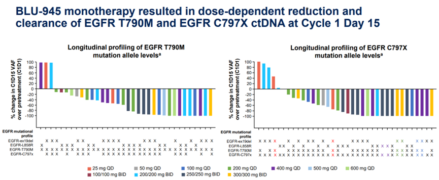 BLU-945单药治疗结果显示:第15天的ctDNA检测时,绝大多数患者的T790M和C797X(主要为C797S)突变丰度下降(图2);能够观察到患者肿瘤体积缩小,其中2例患者达到了部分缓解,此次观察到临床获益有限,Blueprint解释可能是由于晚期疾病异质性和脱靶耐药性导致的。