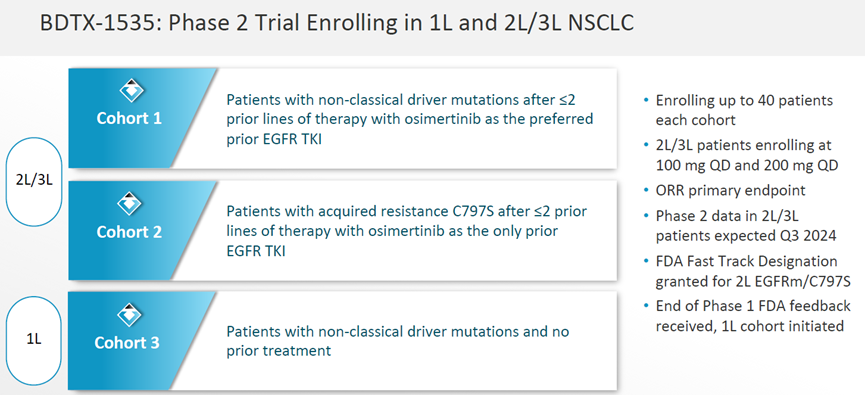 BDTX-1535被FDA授予快速通道资格,用于二线治疗EGFR C797S突变NSCLC患者,目前BDTX-1535正在开展2期一线、二/三线治疗NSCLC患者的临床试验,其中二/三线治疗NSCLC患者的临床试验的2期数据预计将于2024年第三季度公布(图7)。