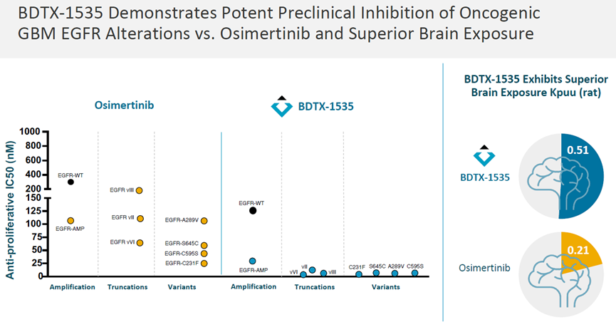 BDTX-1535在胶质母细胞瘤(GBM)临床前研究中也显示很好的疗效,对EGFR突变GBM有很好的抑制活性并且在脑内有很高的暴露量(图8)。