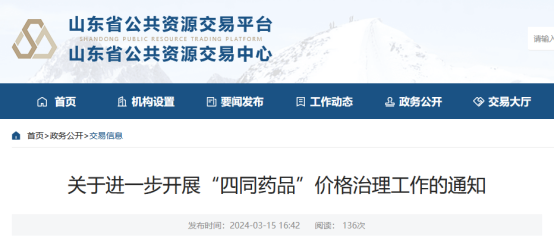 日前,山东省公共资源交易中心发布《关于进一步开展“四同药品”价格治理工作的通知》,对“四同药品”价格治理工作作出部署:挂网价格高于“监测价”或外省省级平台挂网低价的,相关药企须在3月16日-3月20日内进行申报。