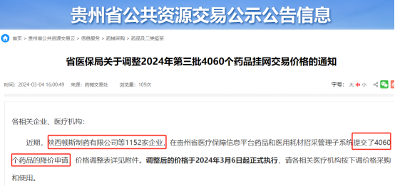 3月4日,贵州省医疗保障局发布《省医保局关于调整2024年第三批4060个药品挂网交易价格的通知》,于今年3月6日起正式执行调整后的药品价格。