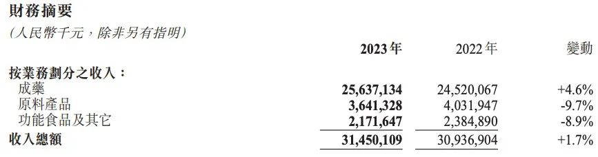 3 月 20 日,石药集团公布了 2023 年度业绩情况。截至 2023 年 12 月 31 日,收入总额 314.50 亿元,同比增长 1.7%;其中成药业务收入 256.37 亿元(+4.6%),原料产品业务收入 36.41 亿元(-9.7%),功能食品及其他收入 21.72 亿元(-8.9%)。