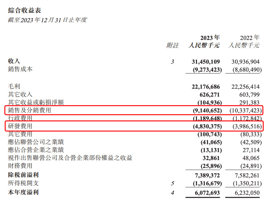 经营开支方面,石药 2023 年继续投入研发,研发费用增长 21.2% 达到 48.30 亿元,占总营收 18.8%;继续扩大各产品市场覆盖和新产品上市推广的同时,也提高营销活动的效率,销售及分销费用减少 11.6%,为 91.41 亿元。