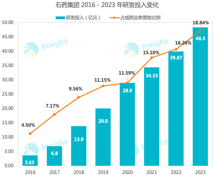 研发投入方面,2023 年石药仍增长 21.2% 达到 48.30,占营收比例在持续稳定上浮。